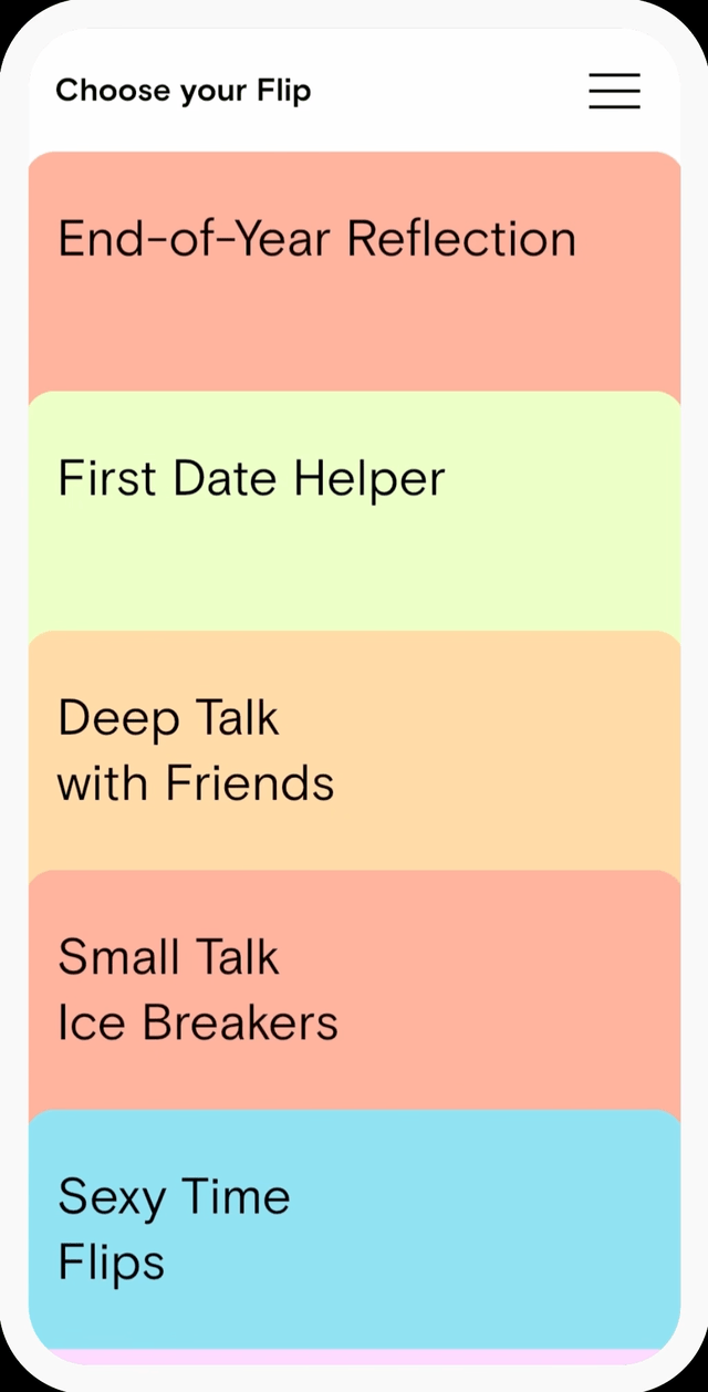 Break the ice. Deepen connections. Spice things up. Get down with friends. Find your me-time. And meet your fears head-on. All with Flips — an interactive resource of cherry-picked questions to deepen conversations and make life more conscious and fun.